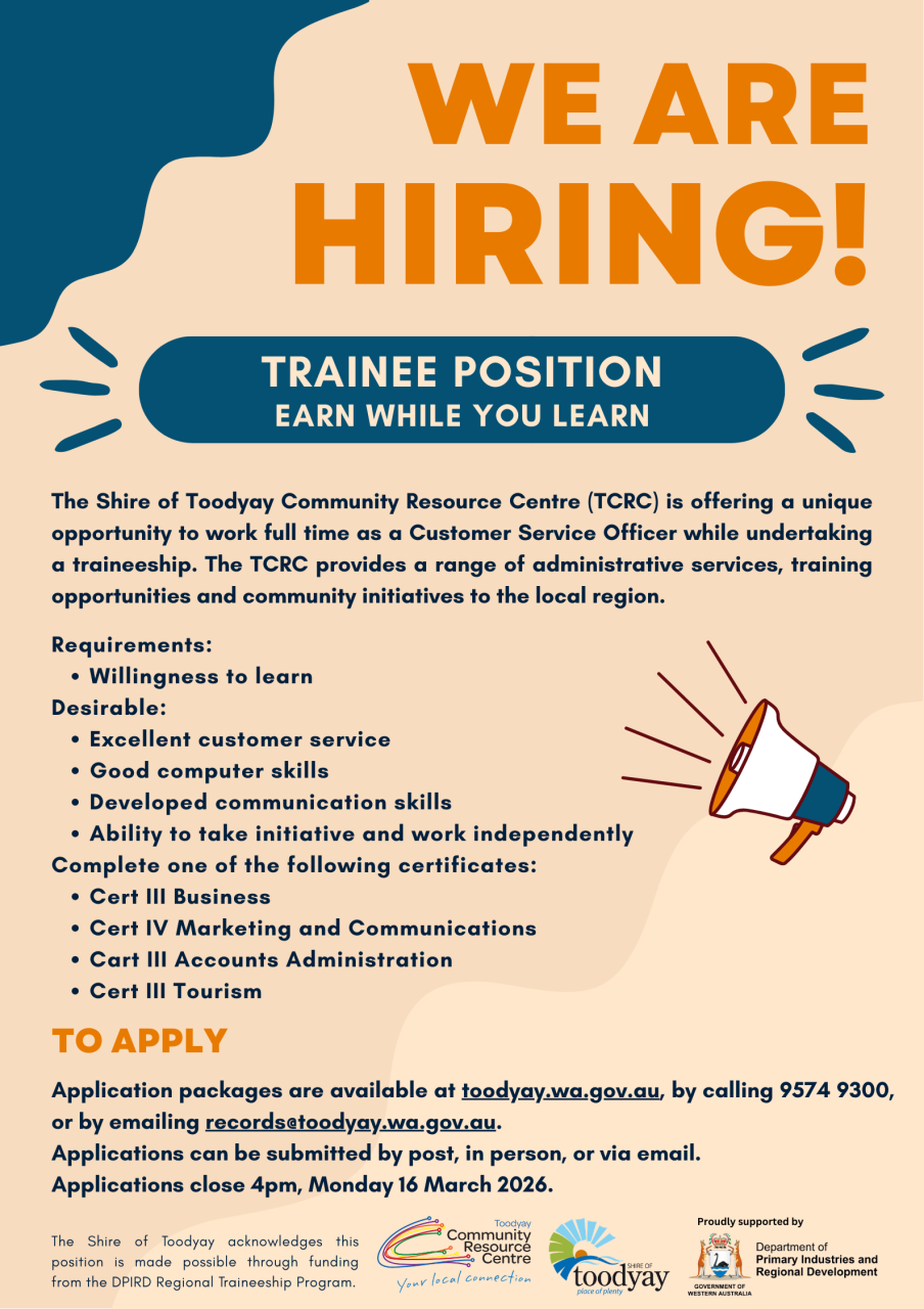 Visit link below for Application Package and Position Description:Toodyay CRC Customer Service Officer - Trainee Application Package