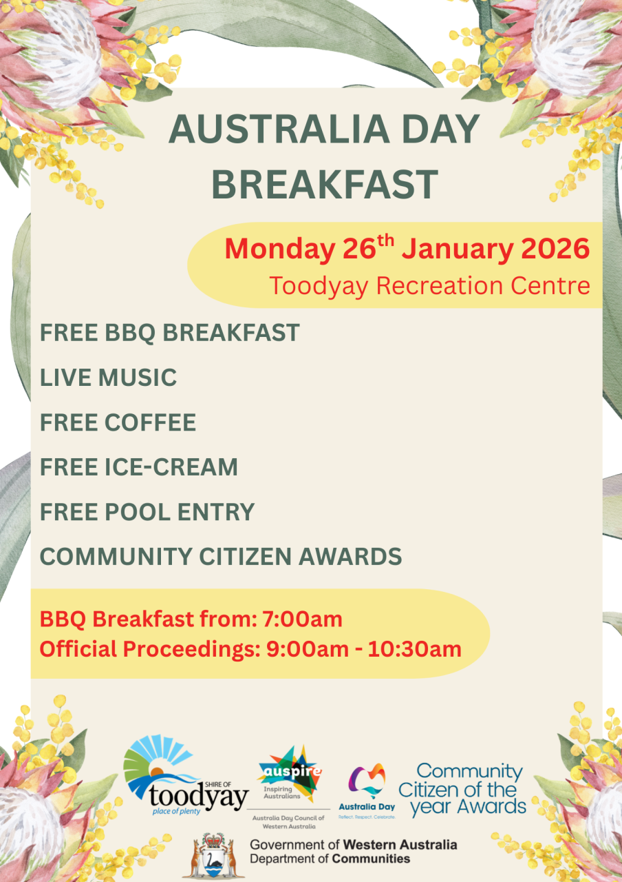 Australia Day celebrations this year will be held at the new Toodyay Recreation Centre. Commencing with a free breakfast from 7.00am followed by official proceedings from 9.00am. Come along and welcome those who are becoming Australian citizens. And celebrate our nominees for Community Citizen of the Year Awards: Active Citizenship Award (for community groups or events) Toodyay Cricket Club Inc. Newcastle Park - Parkrun Young Community Citizen of the Year Thomas & Nicholas Thornton Shane McGlasson Connor McLerie Sean Ladyman Senior Community Citizen of the Year Barry Keens Jeffery Roberts JP Maxine Milburn Philip Roberts Community Citizen of the Year Roz Davidson Shane MacGregor Stephen and Liz Ferguson