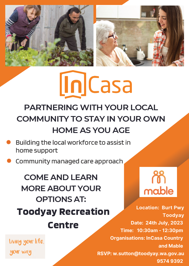 InCasa Aged Care and Community Services is a WA-based provider of in-home care, assisting seniors who need support to remain living independently in their homes. From helping carry out everyday tasks that are becoming challenging, to supporting active participation in family and community life – using a community-managed care approach – InCasa ensures seniors can continue to live life their way for as long as possible, with an additional focus on building the local workforce to assist in home support. As a follow-up to our Staying in Place session held in June, find out more about InCasa’s services and how they can help you or your loved ones retain independence through age at our InCasa Country information session on Monday July 24. Join us from 10.30am-12.30pm at the Toodyay Recreation Centre Pavilion – RSVPs essential on 9574 9392 or via email.
