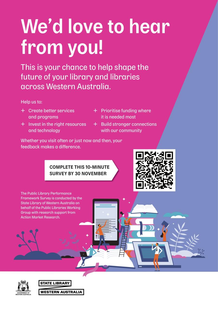 The State Library Western Australia is conducting a statewide survey to better understand how public libraries support our communities. Whether you’re a regular visitor or just drop in now and then, your feedback will help SLWA to: