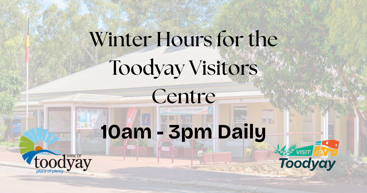 The Visitors Centre will be operating under winter hours as of the 28 April 2026. Our new opening hours are 7 days a week, from 10:00am to 3:00pm. The Toodyay Visitors Centre continues to provide the same, high-quality service, and we look forward to your continued support.